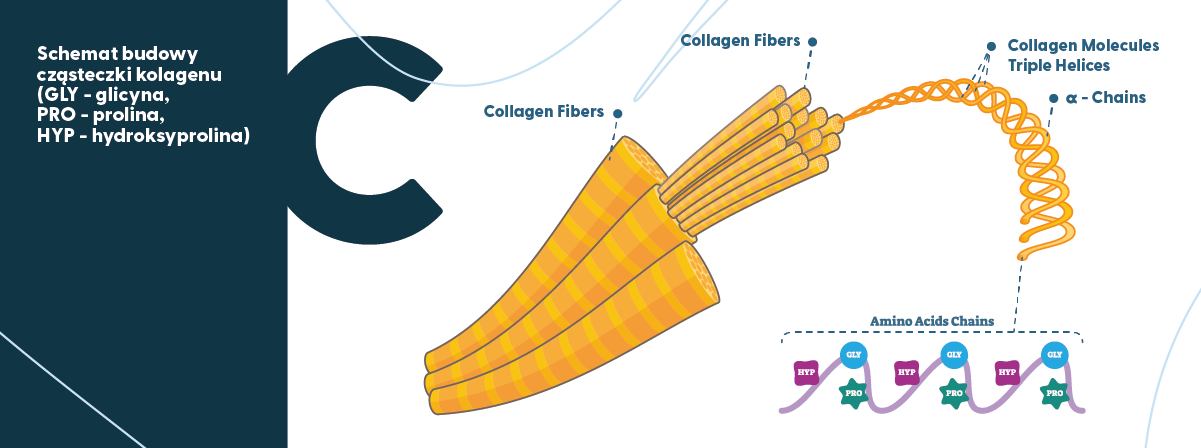 Kolagen możemy sobie wyobrazić jako „gorący klej”. W ujęciu naukowym, kolagen to polipeptyd – prawoskrętna alfa-helisa tripeptydowa (tworząca kolagen) składający się z różnych aminokwasów, m.in. glicyny, argininy, proliny, hydroksyproliny i hydroksylizyny. Należy jednak zwrócić uwagę, że spośród wymienionych związków trzy są dominujące: glicyna (Gly), prolina (Pro), oraz hydroksyprolina (Hyp). Co więcej, w tym „aminokwasowym trójkącie” glicyna jest aminokwasem najważniejszym – jej zawartość w kolagenie wynosi prawie 1/3 wszystkich aminokwasów. Dlatego w cząsteczce kolagenu powtarza się sekwencja -Gly-Pro-Y-Gly-Pro-Y- (gdzie Y oznacza dowolny aminokwas – głównie jest to hydroksyprolina). Poza aminokwasami, kolagen zawiera jedynie polisacharydy – zazwyczaj do 2% i cukry proste – zazwyczaj poniżej 1%.