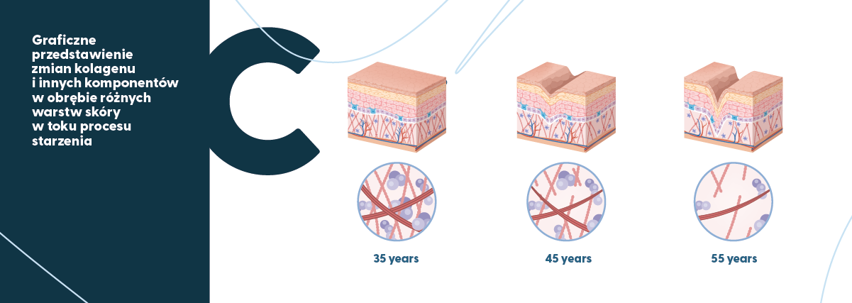 Graficzne ujęcie postępującej wraz z wiekiem degradacji struktury kolagenu i innych elementów tkanek miękkich (na przykładzie skóry) przedstawia rysunek poniżej.