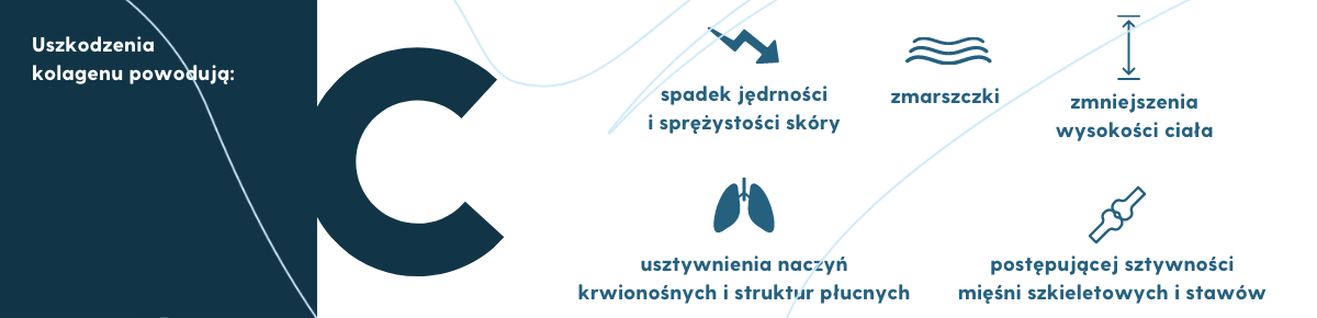 Wyniki wielu badań laboratoryjnych wykazały, że wraz z wiekiem kolagen kumuluje uszkodzenia (patologiczne zmiany) w swojej strukturze molekularnej (np. występują zmiany konformacji przestrzennej czy wolniejszy przebieg proteolizy), które negatywnie wpływają na jego integralność i funkcje (np. utrata właściwości mechanicznych, spadek jędrności i sprężystości skóry). Utrata tych właściwości prowadzi do zmian wyglądu skóry (zmarszczki), postępującej sztywności mięśni szkieletowych i stawów, zmniejszenia wysokości ciała, a także usztywnienia naczyń krwionośnych i struktur płucnych (Bailey, 2002; Haus i wsp., 2007; Saito i Marumo, 2015).