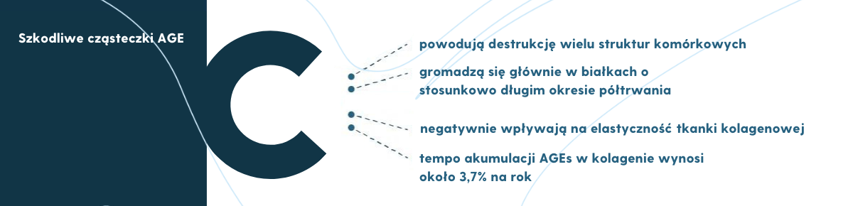 Proces starzenia biologicznego przebiega u ludzi w różnym tempie i często nie jest zgodny z ich wiekiem chronologicznym. Proces glikacji białek (nieenzymatycznej glikozylacji), polegający na powstawaniu nieenzymatycznych wiązań krzyżowych w formie zaawansowanych (końcowych) produktów glikacji (AGEs, ang. advanced glycation end-products), jest jednym z kluczowych patomechanizmów przedwczesnego starzenia. Białka o budowie włóknistej, które pełnią funkcje podporowe, tj. białka fibrylarne (należy do nich kolagen) są bardzo podatne na proces glikacji. AGEs powodują destrukcję wielu struktur komórkowych – zarówno bezpośrednio, jak i pośrednio – przez indukowanie stresu oksydacyjnego i zjawiska gliko- oraz lipoksydacji. Szkodliwe cząsteczki AGE gromadzą się głównie w białkach o stosunkowo długim okresie półtrwania i dlatego bardzo negatywnie wpływają na elastyczność tkanki kolagenowej i ich strukturę molekularną. Względne tempo akumulacji AGEs w kolagenie wynosi około 3,7% na rok. Objawia się to m. in. zmianami wyglądu skóry (zmarszczki), postępującej sztywności mięśni szkieletowych i stawów, zmniejszeniu wysokości ciała, a także usztywnienia naczyń krwionośnych i struktur płucnych. W dodatku endogenna (wewnętrzna) synteza kolagenu nieustannie się obniża wraz z wiekiem.