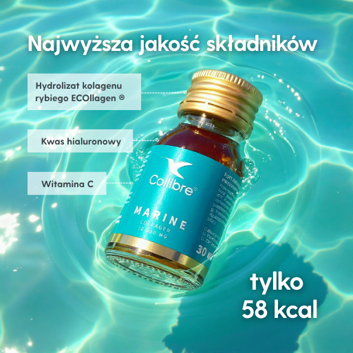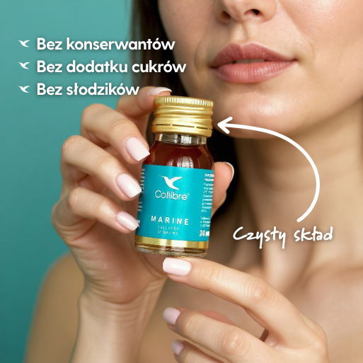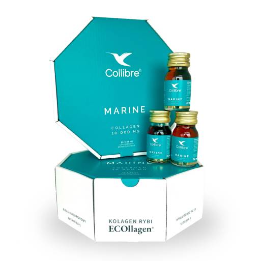 Kolagen morski zastosowany w Collibre Marine to certyfikowany ECOllagen® – wysokiej jakości hydrolizowane peptydy kolagenu typu I, pozyskiwane w sposób zrównoważony z hodowli posiadających certyfikat ASC. Charakteryzuje się niską masą cząsteczkową (1000–2000 Da), dzięki czemu jest łatwo przyswajalny i skutecznie dociera do głębszych warstw skóry.