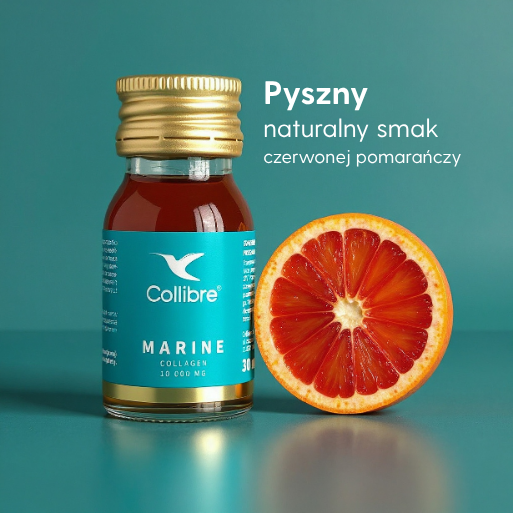 Kolagen Morski Collibre® Marine to suplement diety w formie wygodnego shotu o smaku soczystej czerwonej pomarańczy, stworzony, aby kompleksowo wspierać zdrowie i piękno od wewnątrz. Każda porcja zawiera 10 000 mg certyfikowanego hydrolizowanego kolagenu rybiego typu I ECOllagen®, wzbogaconego o 100 mg kwasu hialuronowego i 80 mg witaminy C – niezbędnej do prawidłowej syntezy kolagenu.