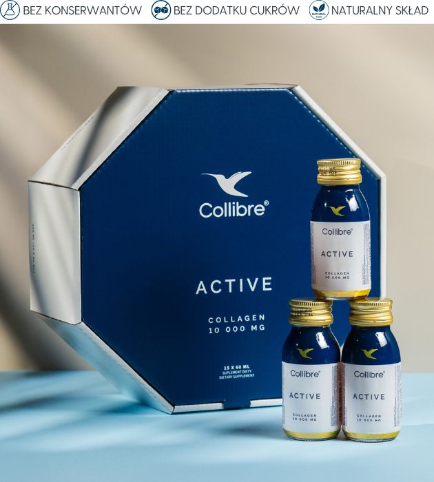 Kolagen Collibre® Active to suplement diety w formie shotu z kolagenem i witaminami dla osób, które chcą dla osób aktywnych fizycznie, które chcą zadbać o lepszą wydolność i szybszą regenerację po wysiłku. Nasz kolagen w formie wygodnych shotów zawiera aż 10 000 mg hydrolizowanego kolagenu z dodatkiem antyoksydantów oraz witamin.