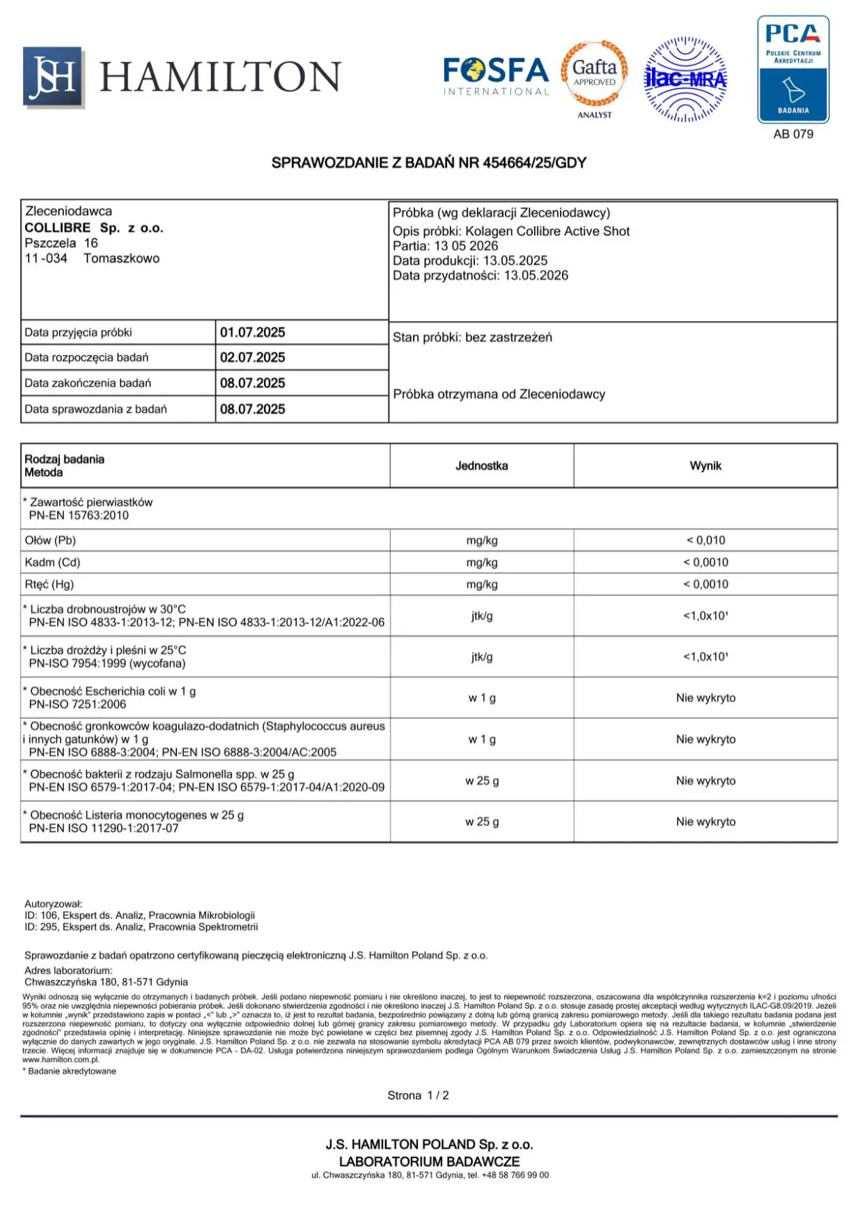 Kolagen Collibre® Active Shot nie zawiera żadnych sztucznych dodatków ani konserwantów.