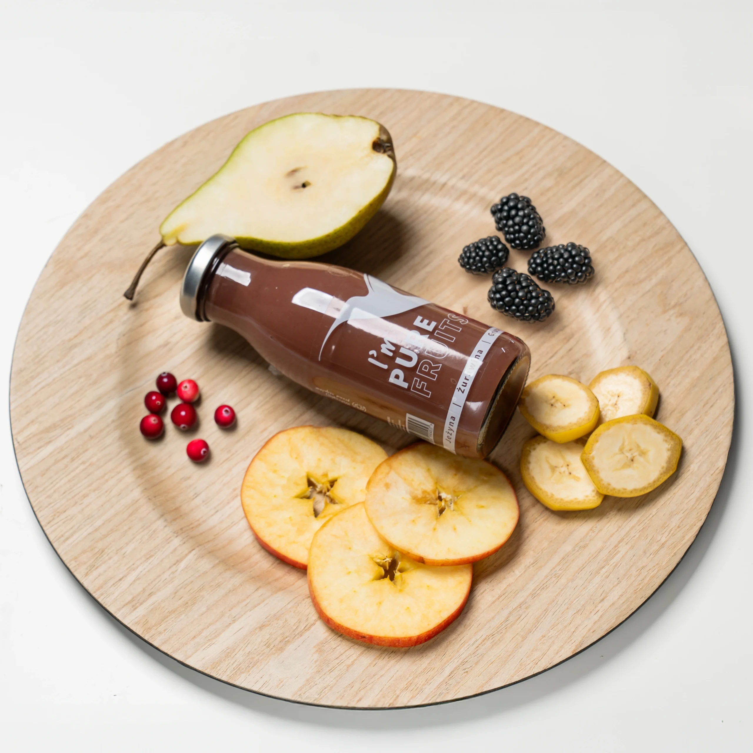 Jabłko 45%, banan 23%, żurawina 17%, gruszka 10%, jeżyna 5%.