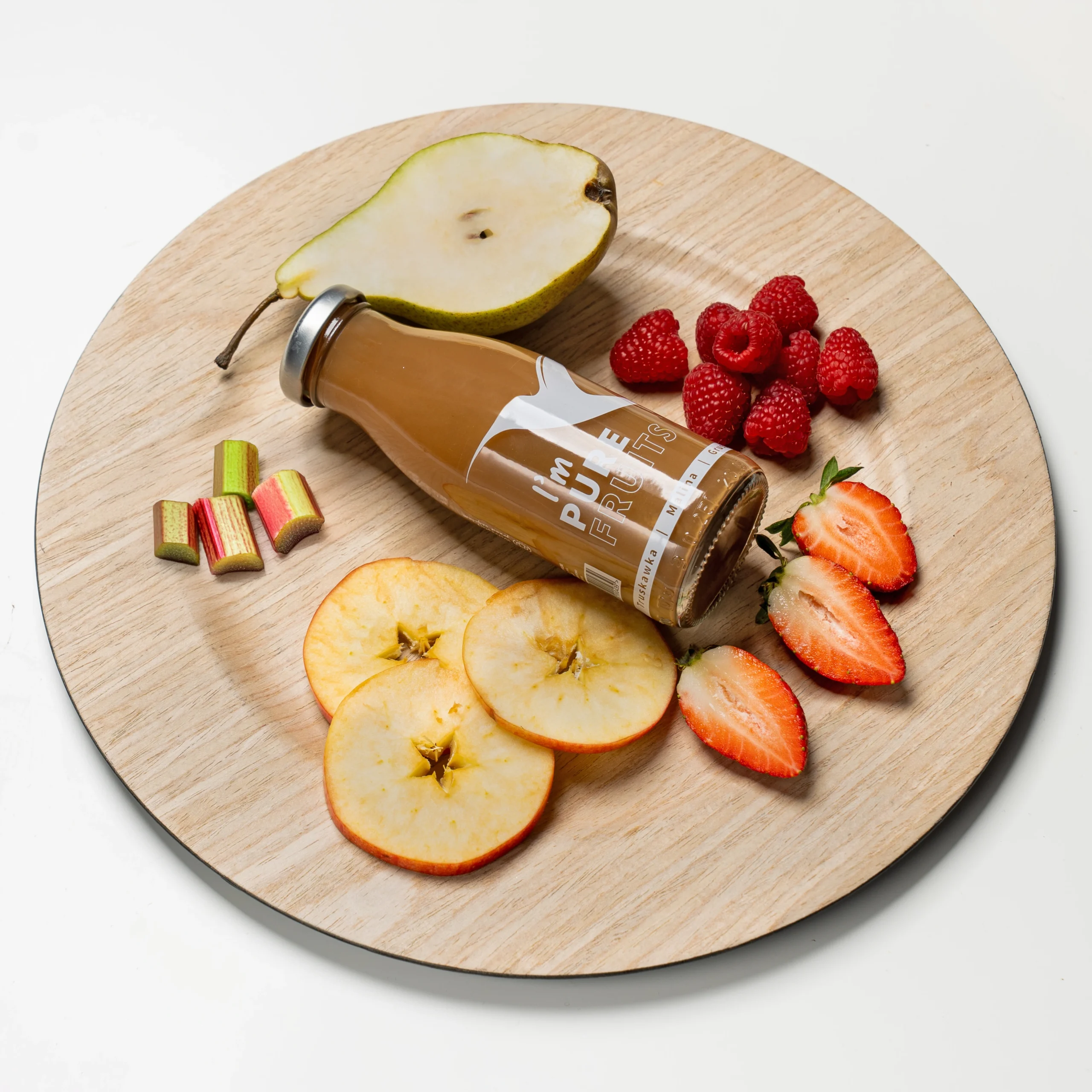Jabłko 45%, rabarbar 20%, gruszka 20%, truskawka 20%, malina 5%.
